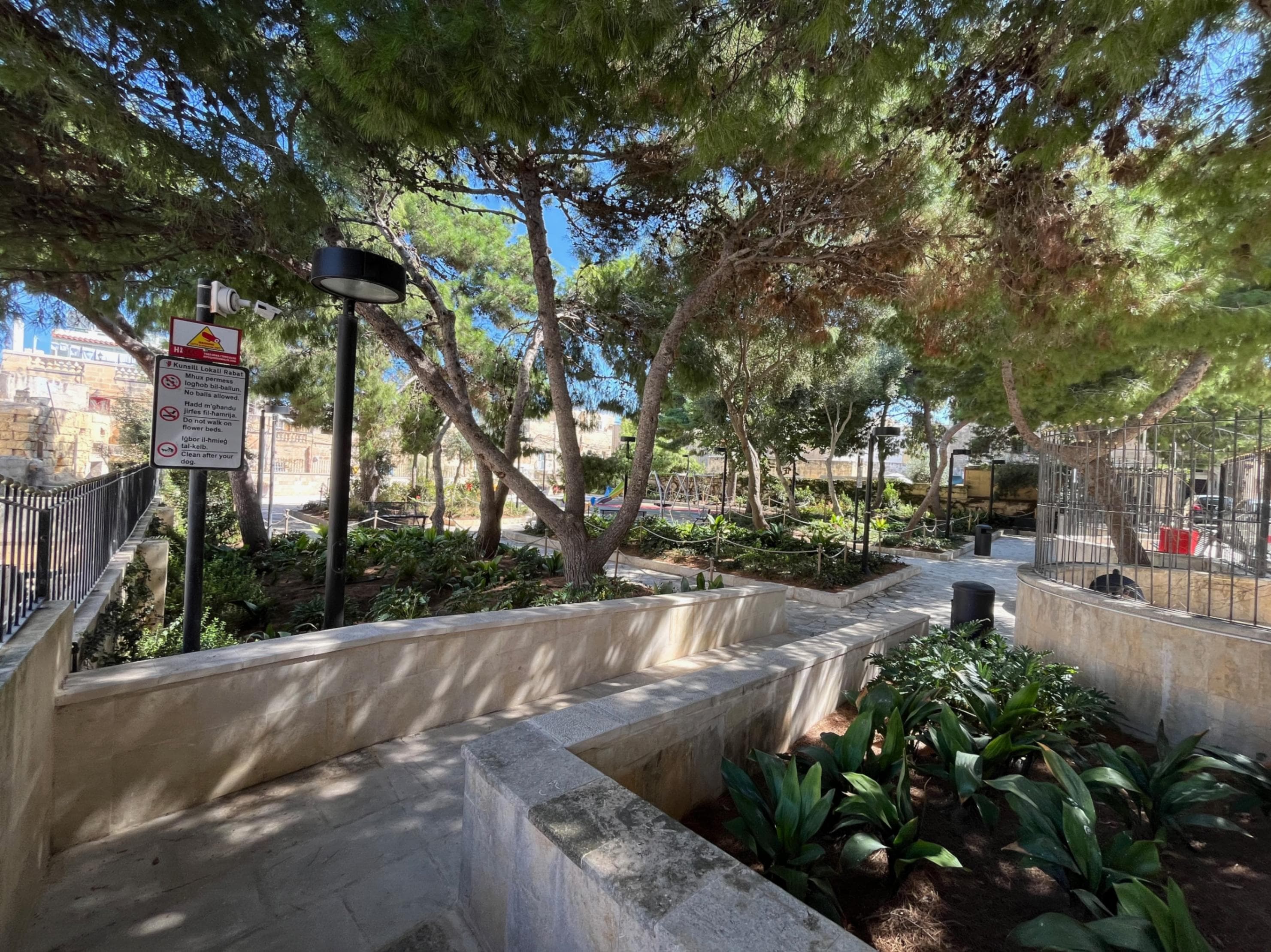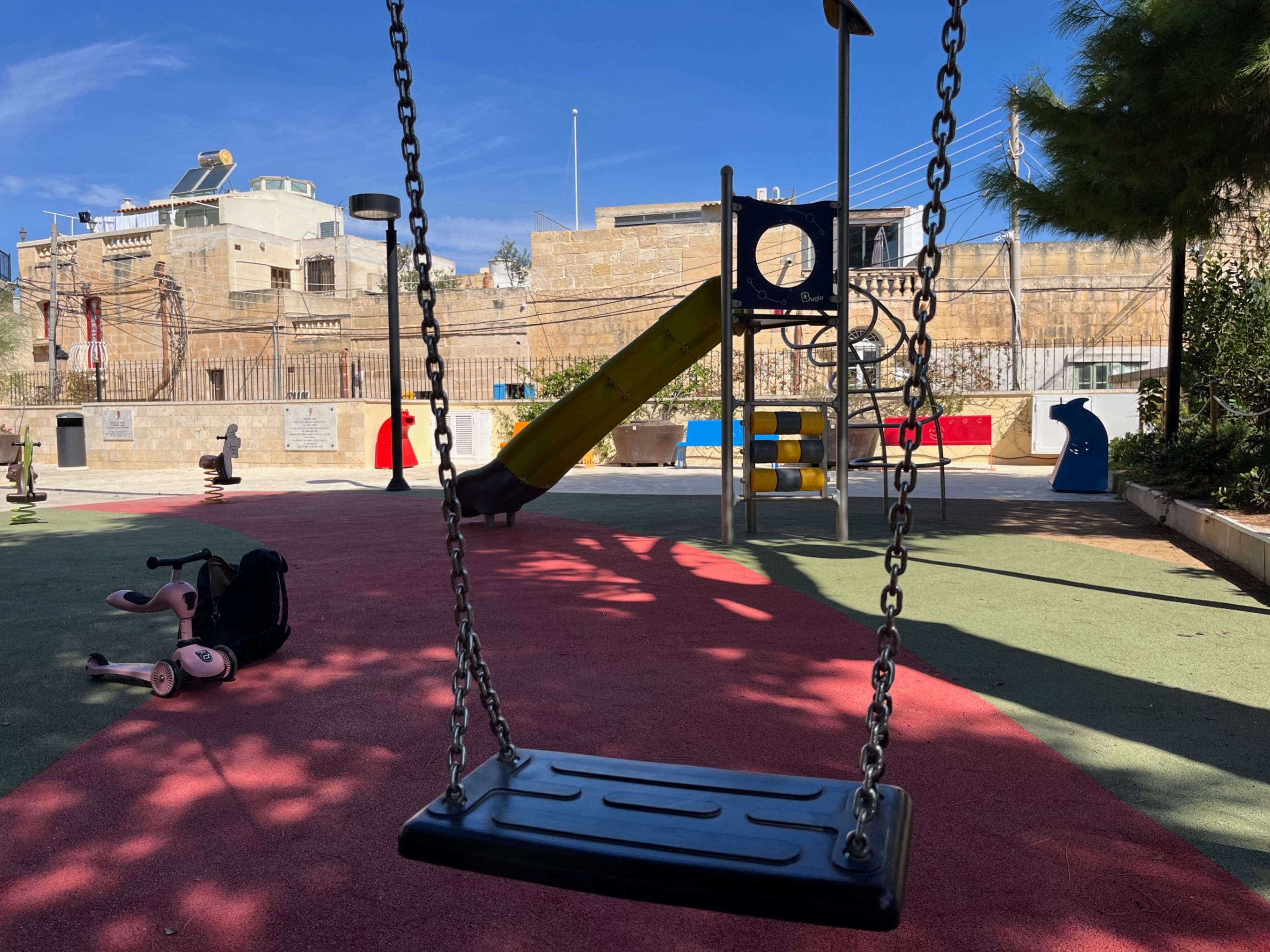 Quiet, shaded location. It doesn’t have many options in terms of equipment for young toddlers but offers plenty of space to use scooter or tricycle. Easy access to Rabat’s coffee shops nearby.