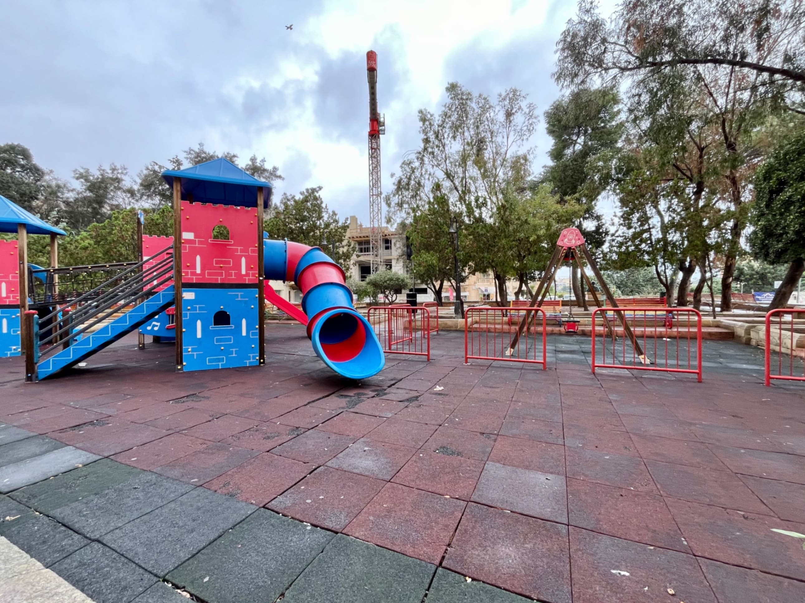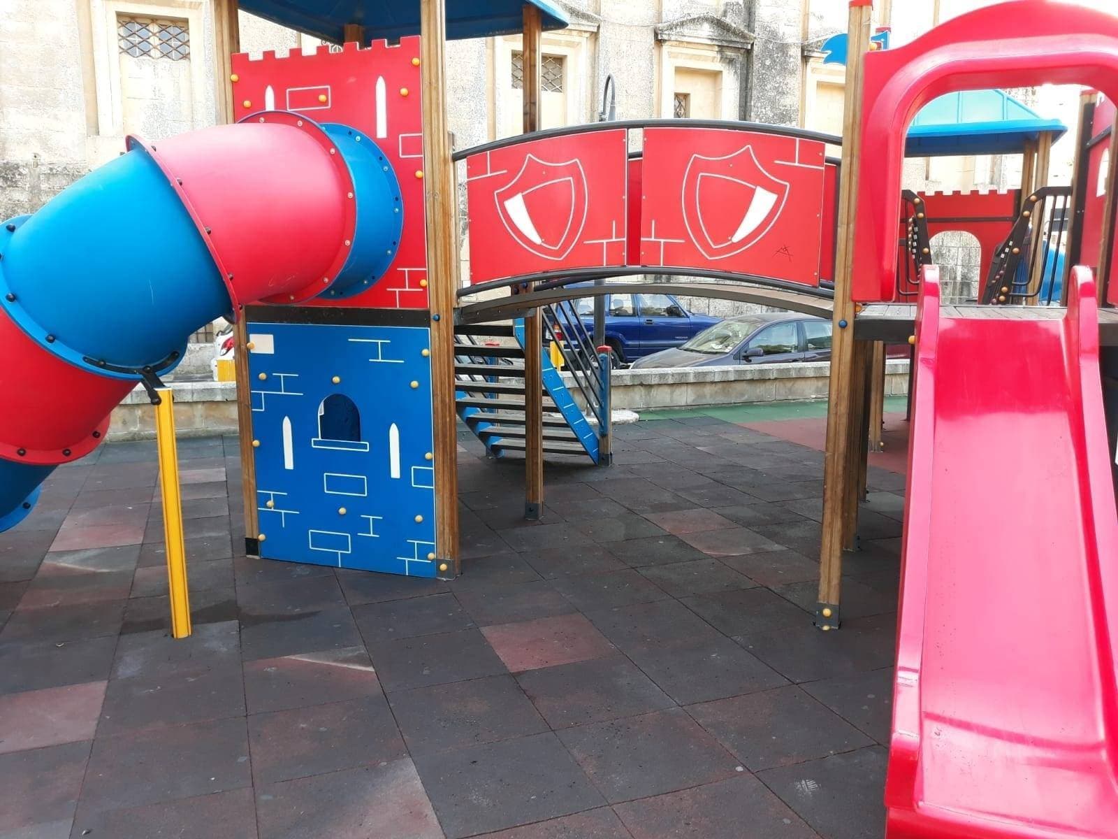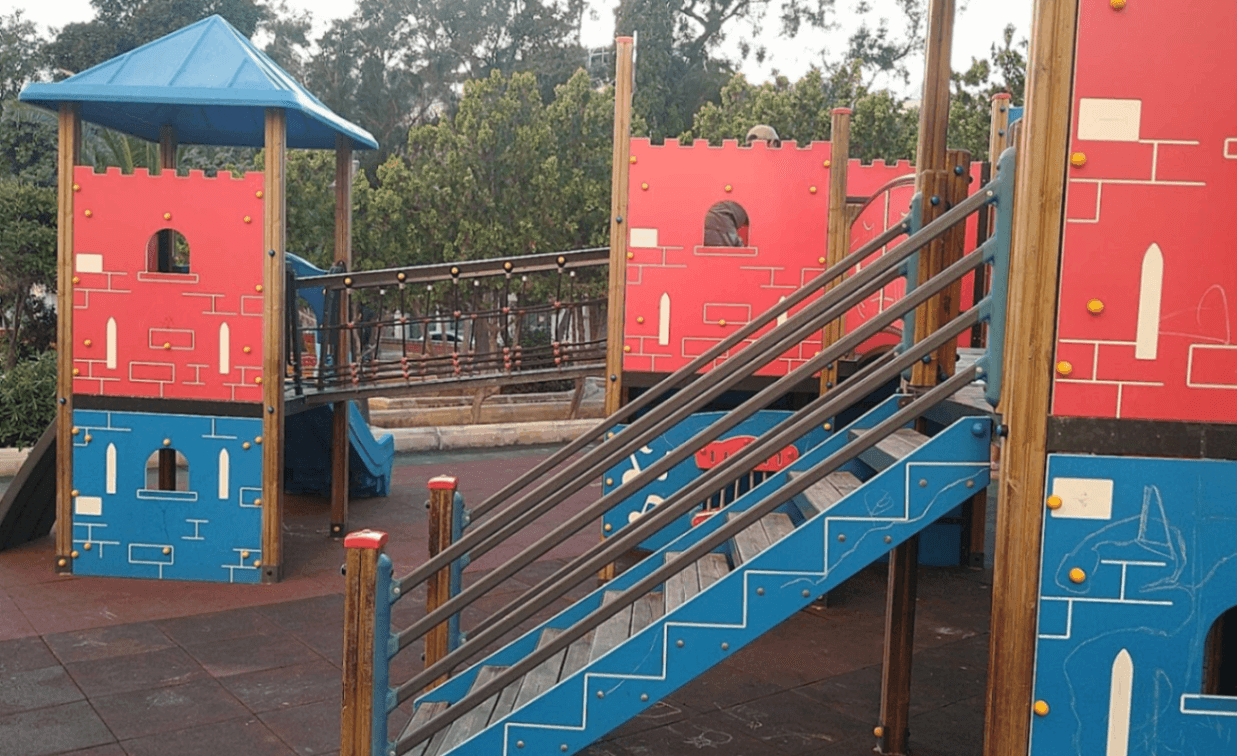 Flooring is coming off, and looks run down. Given they are the main swings in the square Id expect them to be maintained better. Otherwise theres a sea saw, two swings and a slide. Basic but does the job